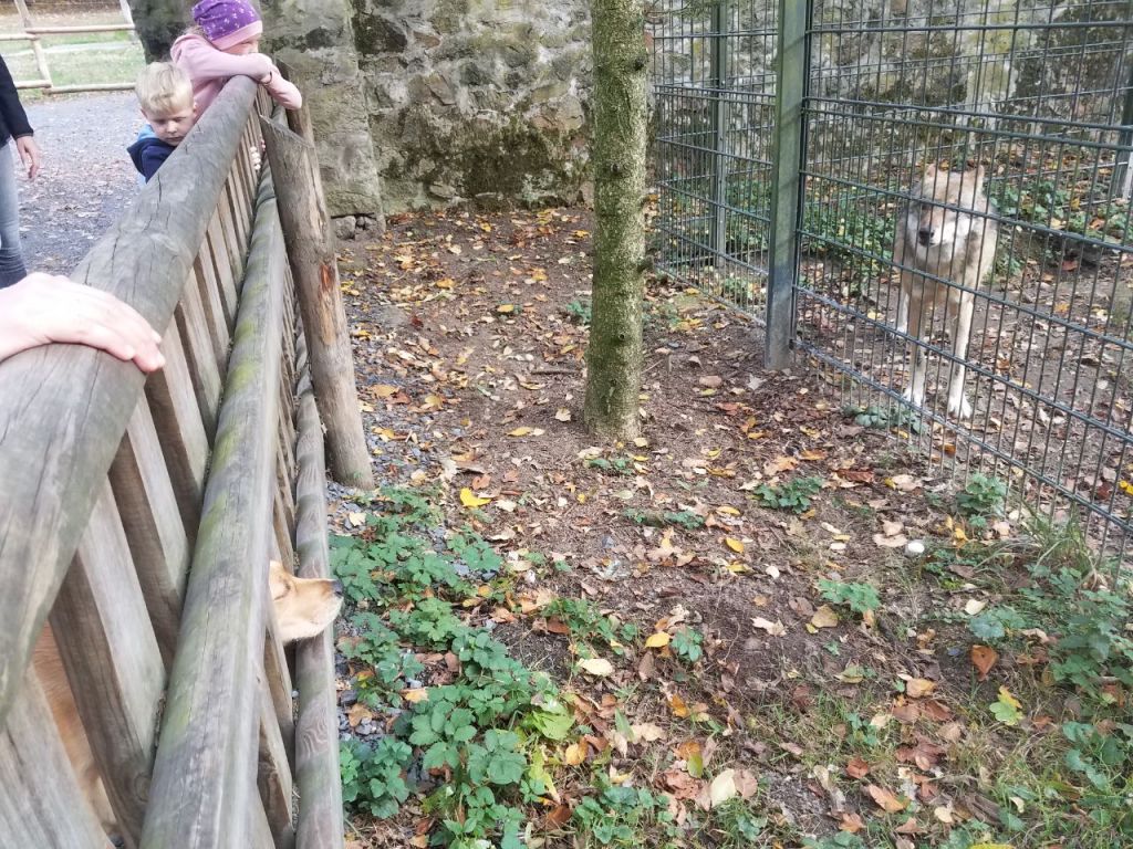 Es gibt drin ein paar Bereiche, wo ein Hund nicht erlaubt ist (bei den Wölfen z. B.). Dann muss einer mit dem Hund draußen warten oder außen rum gehen. Ist aber kein Problem.